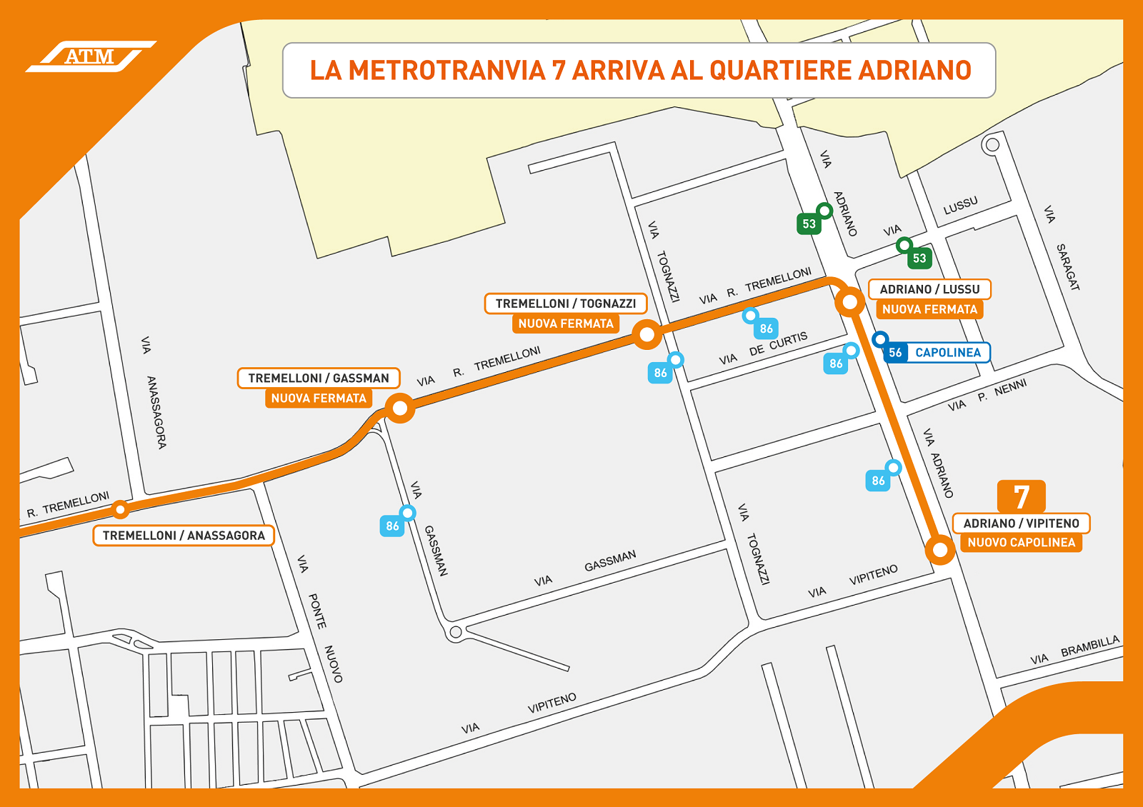 Milano, 16 ottobre 2025 - In data odierna è stato inaugurato il prolungamento della linea tranviaria 7 di Milano dal capolinea di Precotto (Via Anassagora) fino al Quartiere Adriano. La nuova tratta prevede tre fermate ed un nuovo capolinea in via Adriano in corrispondenza con via Vipiteno.