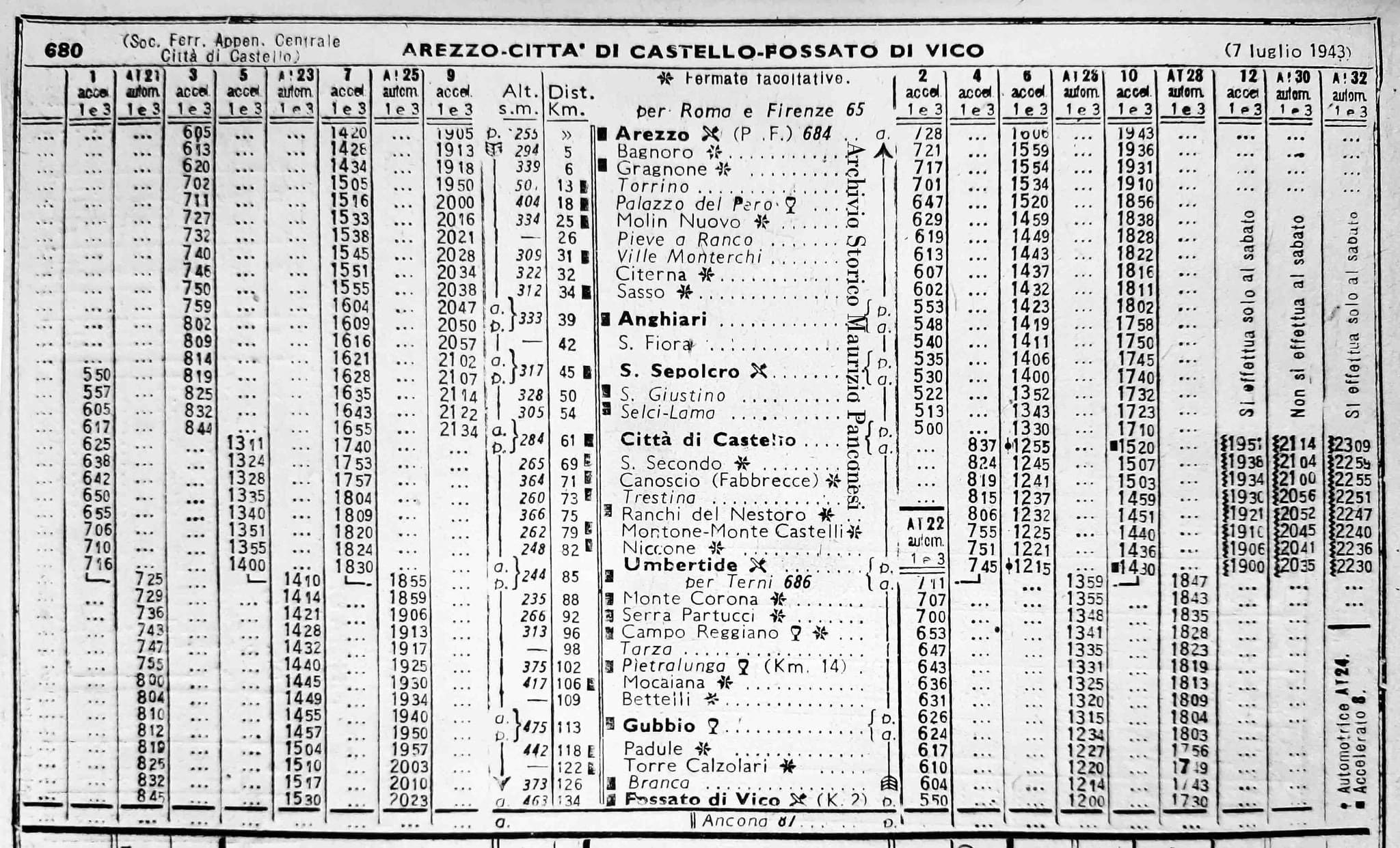 Orario 1943 - Ferrovia dell'Appennino Centrale Arezzo-Fossato di Vico - Fonte: Archivio Storico Maurizio Panconesi